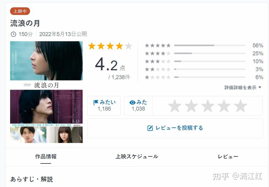《流浪之月》5月13日开画,首周末日本雅虎五分制评分就高达4.1分,这个评分已经高于八年前《怒》3.7的雅虎评分,而且上映两周后,影片评分没有走低,反而随着观影人数的增多冲高到了4.2分,这就相当难得了,在日本雅虎的评分分布图上,可以看到将近六成的观众给予了影片满分五星的标记,加上标记四星的观众,就多达八成,具体分布是56%的观众标注五星、25%的标注四星、10%的标注三星、不到10%的观众标注一星二星,可以说是影片在口碑上是压倒性的绝赞好评。
