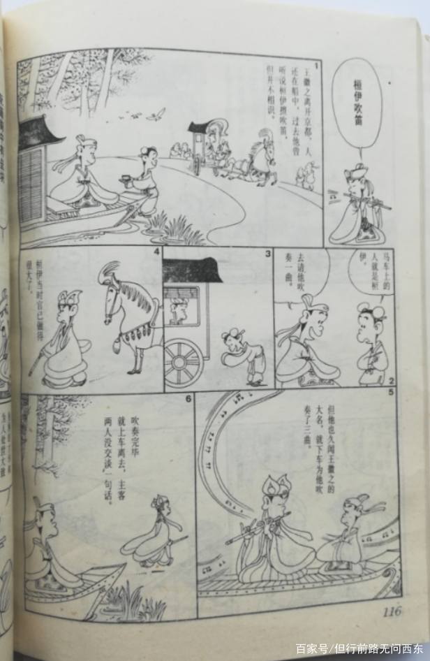 翻开看,每一页的四格方寸之间都充满幽默雅谑,行云流水地演绎出千年前的洒脱无奈。喜欢的典故很多,选两个印象最深的做简单推介。
