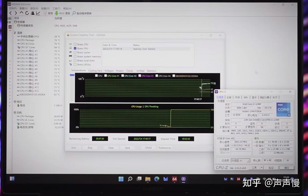 在室温25℃,对小米笔记本Pro 14进行Aida64 Stress FPU模式单靠,整个CPU封装功耗可以长时间45W,其实这就意味着,i5-1240P跟i5-12500h并没有太大区别,功耗直追H45。