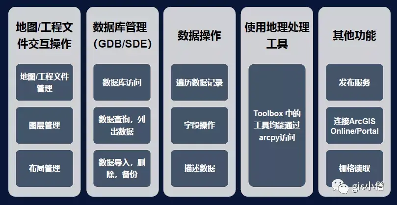 主要用于提供基本的地理对象,操作GP工具,进行基础性地理操作,如获取属性、列出数据等。