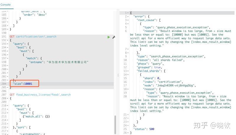 当size设置大于10000时查询会返回异常: