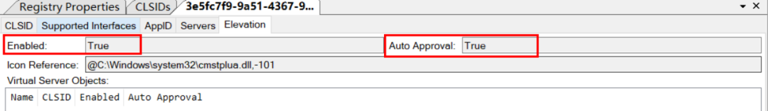 而该组件是具有该属性的,因此如果想要利用COM组件提权,必须满足的条件之一就是 Elevation属性中的Enabled跟Auto Approval为True。