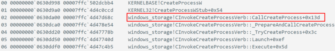 而explorer本身也并非一个SYSTEM权限的进程,如果提权过程是由explorer过程发起,因此也不可能达到提权的目的。为此我们先在KERNELBASE!CreateProcessW下入断点随后正常启动一个程序,查看调用栈分析: