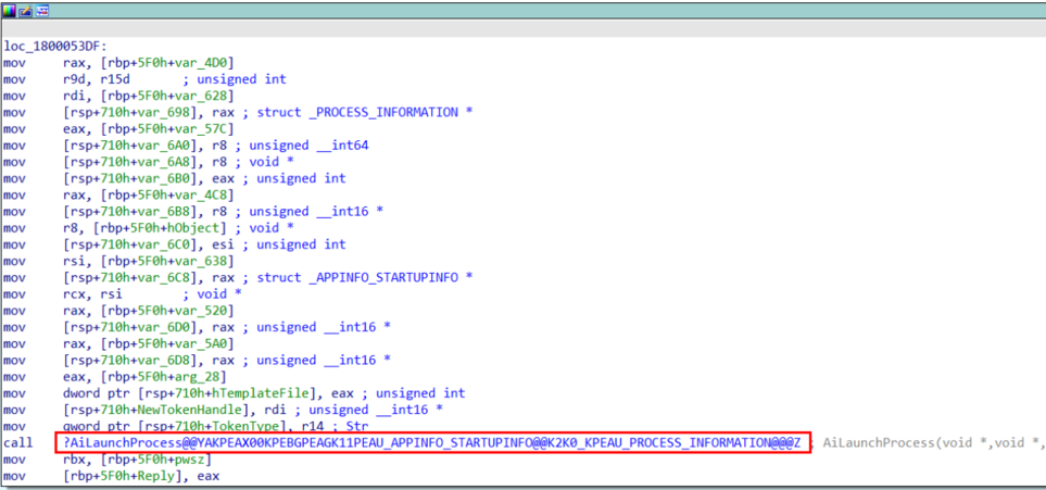 而在之前的了解中已经知道在UAC验证中是使用AiLaunchAdminProcess这个API实现的,根据接口地址找到一个对应函数RAiLaunchAdminProcess,在该函数的实现中找到了AiLaunchAdminProcess: