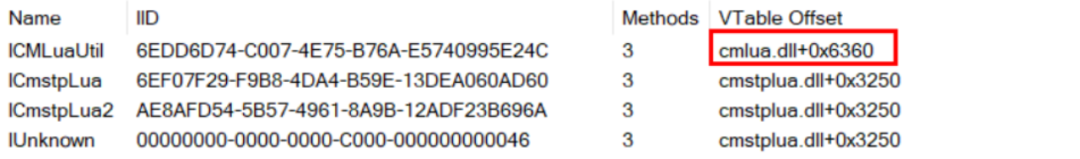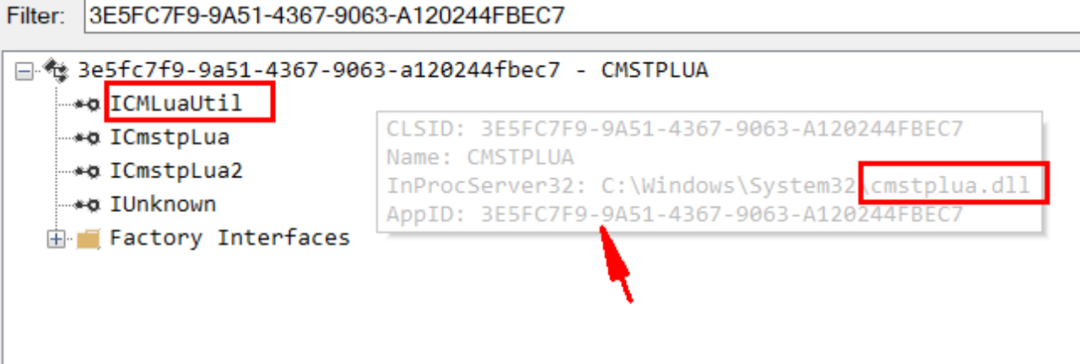 结合源码可知这里利用的是CMSTPLUA组件中ICMLuaUtil接口,来搜索对应的CLSID,对应{3E5FC7F9-9A51-4367-9063-A120244FBEC7}。