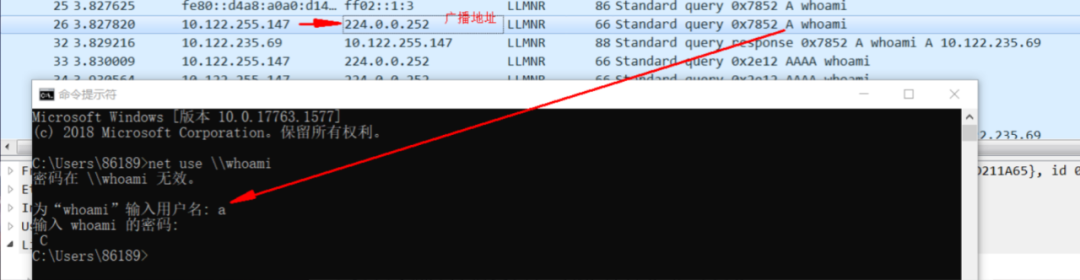 当本机在Hosts文件里面没有找到,通过DNS解析失败。就会通过LLMNR协议进行广播,前文已经说过LLMNR的广播地址对应的就是224.0.0.252。