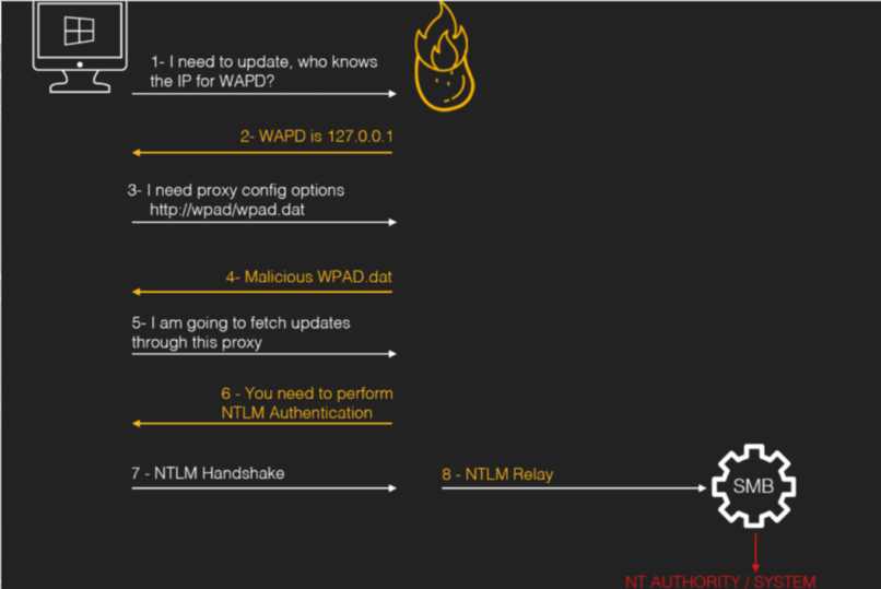 有关详细的原理讲述可以参考原作者的文章,在这里的核心思想是通过NTLM中继(基于HTTP->SMB中继)和NBNS欺骗。