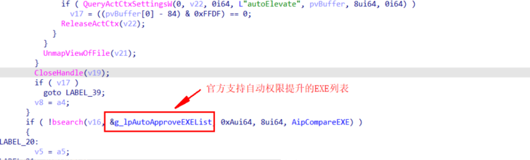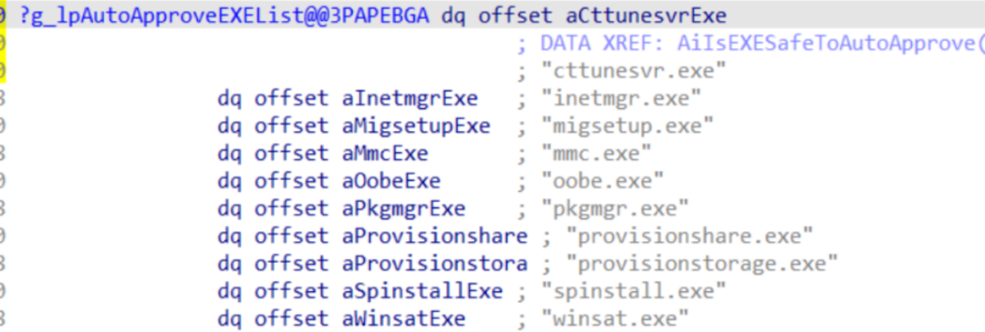 此时得到了官方支持的具有autoElevate的可执行文件名单,也就是UAC白名单。
