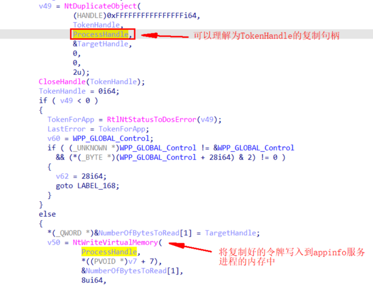之后通过NtDuplicateObject和NtWriteVirtualMemory将提升权限后的令牌写回至appinfo服务进程中。
