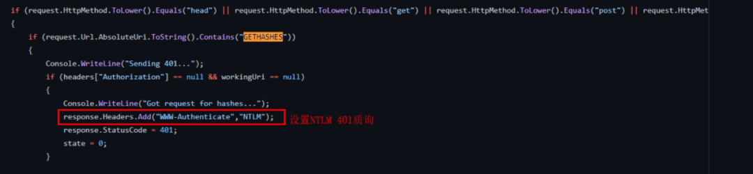 在Potato漏洞利用中,所有HTTP请求都通过302重定向重定向到 http://localhost/GETHASHESxxxxx,其中xxxxx对应一个唯一标识符。请求http://localhost/GETHASHESxxxxx响应NTLM身份验证的 401 请求。