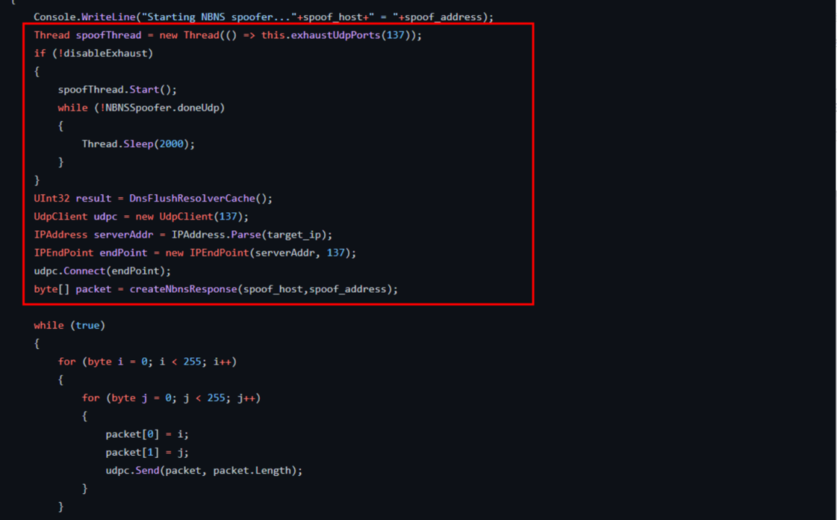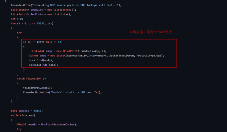 前文提到如果网络中有DNS记录,此时就不会用到NBNS协议,作者使用称为UDP端口耗尽的技术来强制系统上的所有DNS查找失败,当请求已经没有可用的UDP资源时,DNS查找失败便会通过NBNS进行广播查询。