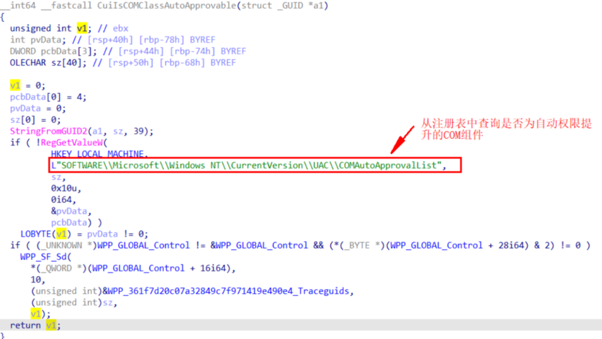 在前文我们已经了解UAC的整个过程,知道在consent程序会调用CuiIsCOMClassAutoApprovable函数判断是否存在自动权限提升的COM组件,其中判断的标志就是搜寻elevation属性中是否为auto Approval。