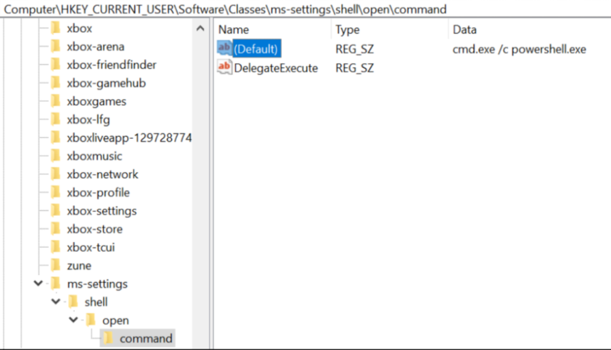 HKCU:\Software\Classes\ms-settings\shell\open\commandHKCU:\Software\Classes\ms-settings\shell\open\command\DelegateExecuteHKCU:\Software\Classes\ms-settings\shell\open\command\(default)