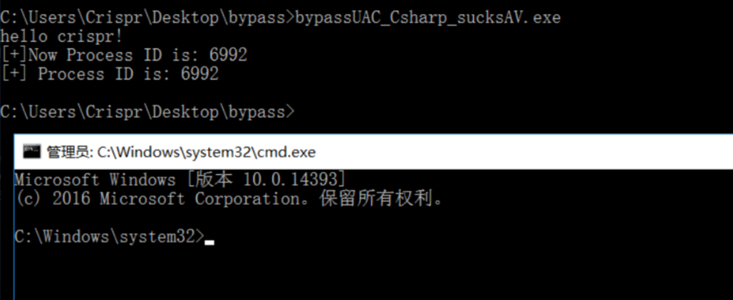 我们执行该程序发现现在并不会弹出UAC框并且成功获得管理员权限的cmd进程: