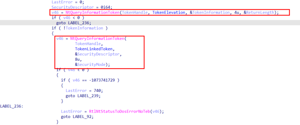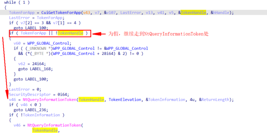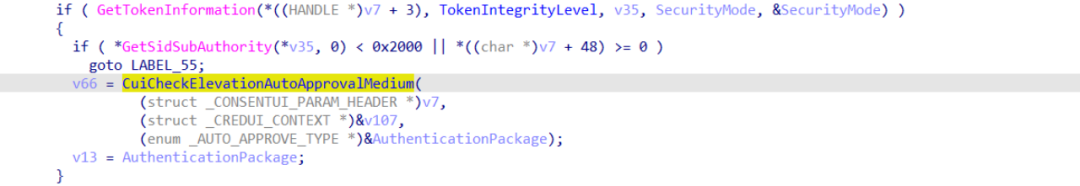 谈到这里,可能还是得回到consent程序中来看,其实整个UAC的过程就是appinfo和consent横跳的过程,接CuiCheckElevationAutoApprovalMedium判断完成之后通过LABLE_78调用NtQueryInformationToken来获取一个权限提升的令牌。