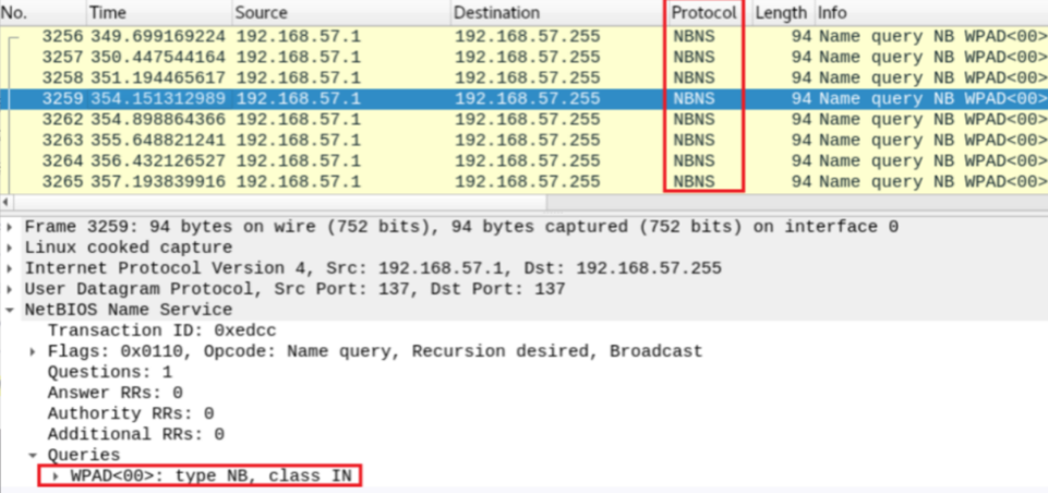 在下面的流量捕获中,机器以广播方式发送NBNS数据包,请求wpad.dat: