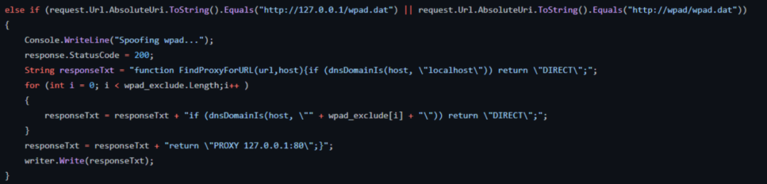 同时,我们在127.0.0.1本地运行一个HTTP服务器。当它收到对 http:// wpad/wpad.dat 的请求时,它会响应如下:
