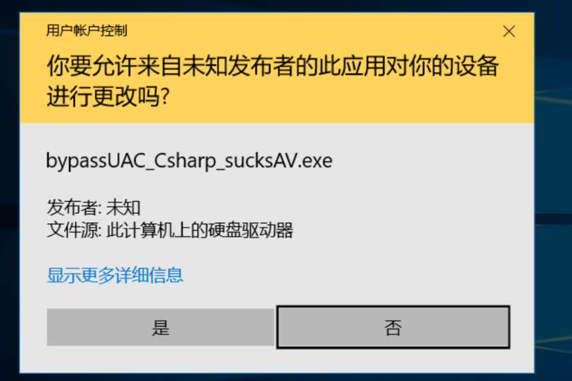 当编译完成运行时却发现程序依然还是会弹出UAC框进行验证,这是因为如果执行COM提升名称(COM Elevation Moniker)代码的程序身份是不可信的,则会触发UAC弹窗,这里我们的程序并没有经过验证。