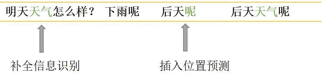 对于信息补全类 ,先是识别出上下文中的关键信息“ 天气 ”,然后识别出A2中需要补全信息的位置在" 呢 "之前。