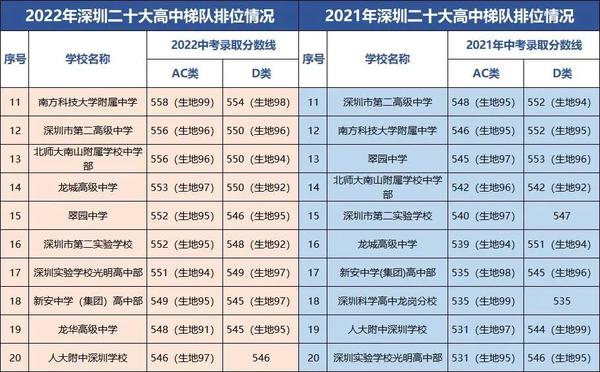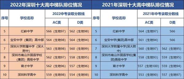 人气高中的红岭和宝安中学在十大里面算佼佼者,最近两年的中考录取分数线也是你追我赶,2022年红岭仍是占据高于宝中两分的优势。