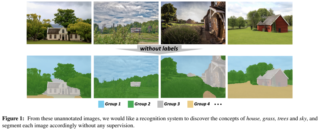 2.什么是无监督语义分割呢?如这张图片所示,将没有标签的数据集作为输入,能够将图中的每个像素都输出为标记成不同事物的标签,例如下面的蓝色一部分标记为天空,绿色为树,灰色为房子,褐色为地面。