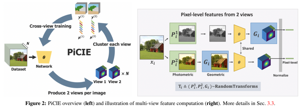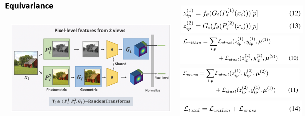 4.左图为PiCIE的整体流程,其基于深度卷积框架。首先将数据集输入,经过光度不变、几何等变以及卷积神经网络的转换从而得到每个像素的特征表示,而后经过聚类得到聚类中心并且为每个像素分配标签,再将得到的标签作为伪Groundtrue进行迭代,最终得到一个稳定的结果。右图为光度不变性以及几何等变性的具体操作方法。接下来详细介绍该模型。