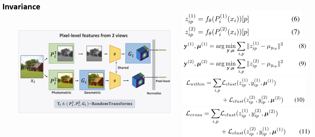 6.接下来是光度不变性,首先什么是光度不变性呢?其实就是当一幅图像的光照强度发生轻微的抖动时在同一位置的像素应该被划分得到相同的标签,而不应该改变。在此论文中表现为将每一个像素点进行两种不同的光度变换后得到的特征表示应当相同。图中P1,P2就表示为同一像素点的两种不同光度变换,式子6、7为同一像素点两种光度变换后的结果。由于光度不变的想法,我们对Z1,Z2聚类后他们应当满足 与自身的簇中心越近越好(用Lwithin约束),以及 自身应当也与另一光度变换的簇心越近越好(用Lcross约束)。到此就实现了光度的不变性。