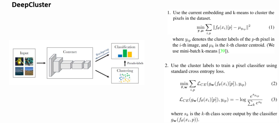 公式(1):将当前的 embedding 通过 k-means 聚类,得到标签及聚类中心,其中 f_\theta(x_i)[p] 表示第i张图片的像素点p的特征表示, \mu _{y_{ip}} 为聚类中心。