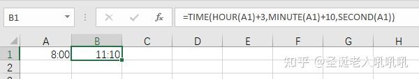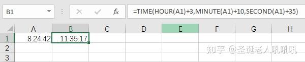 TIME 函数有 3 个参数。首先,使用 HOUR、MINUTE 和 SECOND 创建在单元格 A1 中输入的时间。接下来,添加 3 小时 10 分钟0秒。