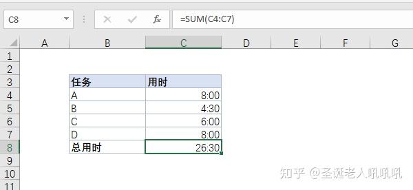 如果这个时候总用时显示的时间是2:30,而不是26:30,我们就需要调整单元格格式。