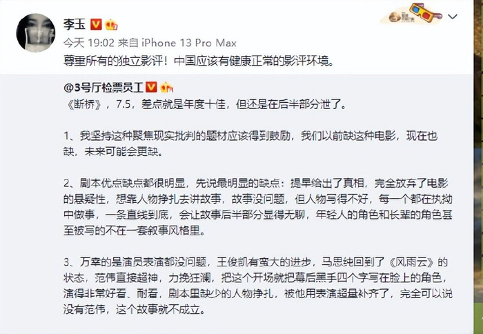随后断桥导演李玉看到这个博主的发言后也发声留言说:尊重所有的独立影评!中国应该有健康正常的影评环境。看得出来李玉还是非常大度的,不管网友和博主怎么批评她都没有生气,反而让以后的影评甚至全国的影评都有一个健康正常的影评环境,先不管这部电影怎么样,但是李玉导演的态度确实令人敬佩。