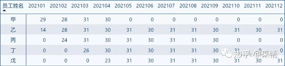 选择一个月份,利用表格就可以展示出每个员工的当月在职天数:
