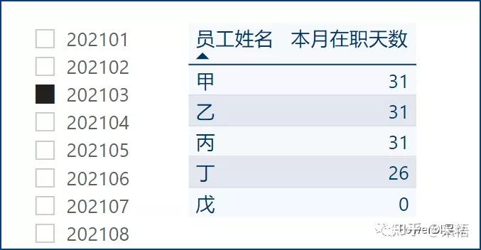 需求是统计每个员工的某个月的在职天数,那么员工姓名、月份应该作为筛选器来动态选择,利用度量值获取当前的上下文,结合员工表的信息来进行计算。