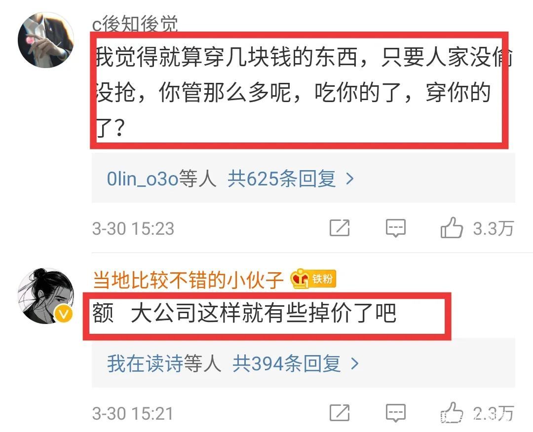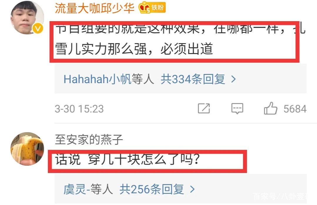 而这篇有关孔雪儿的动态也被香蕉娱乐官博转发,并配文“倒也不必卖尬惨”,随即登上热搜榜。让不少网友为孔雪儿抱不平,“人家穿几十元的衣服怎么了”“大公司有些掉价”等等!