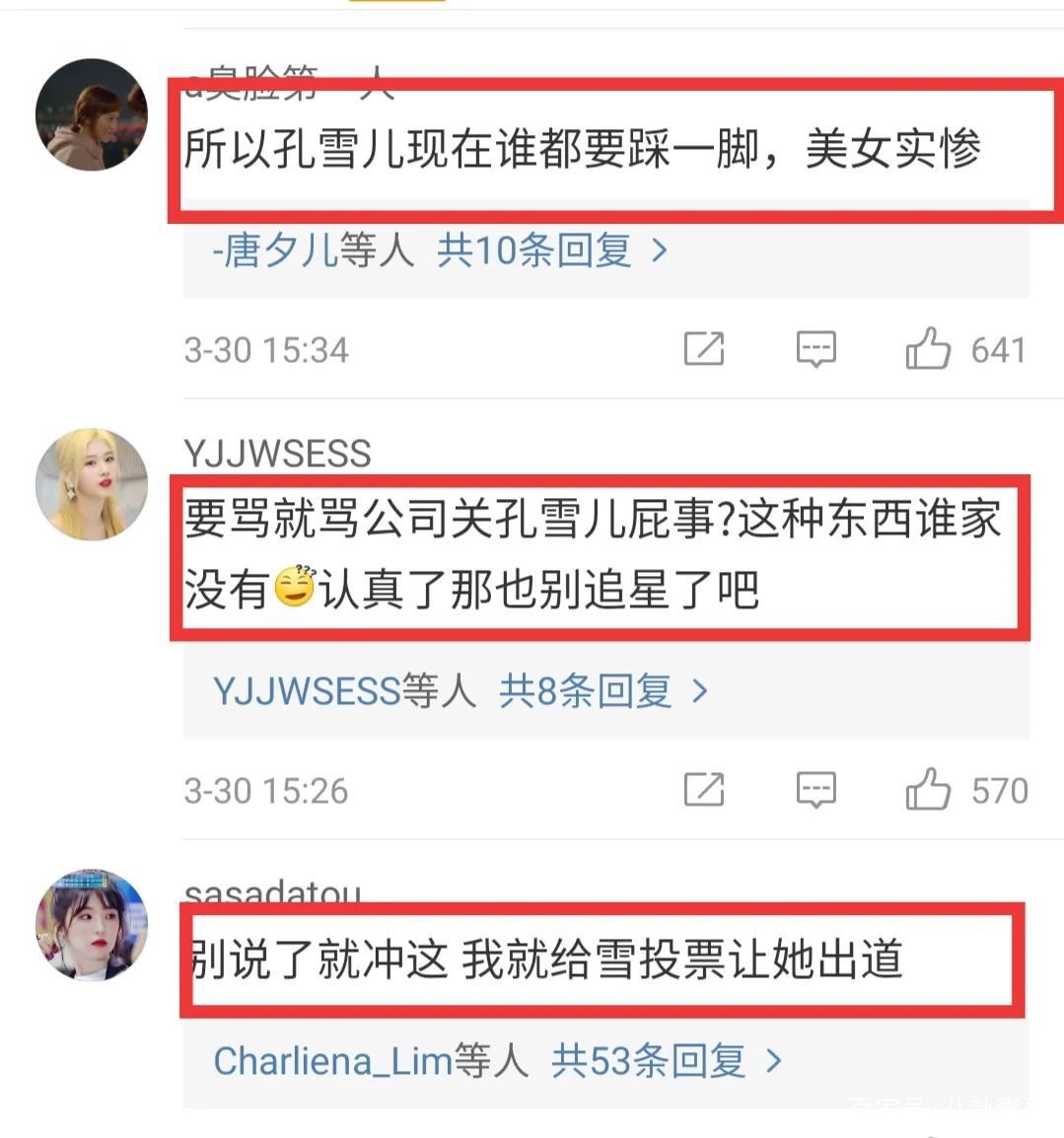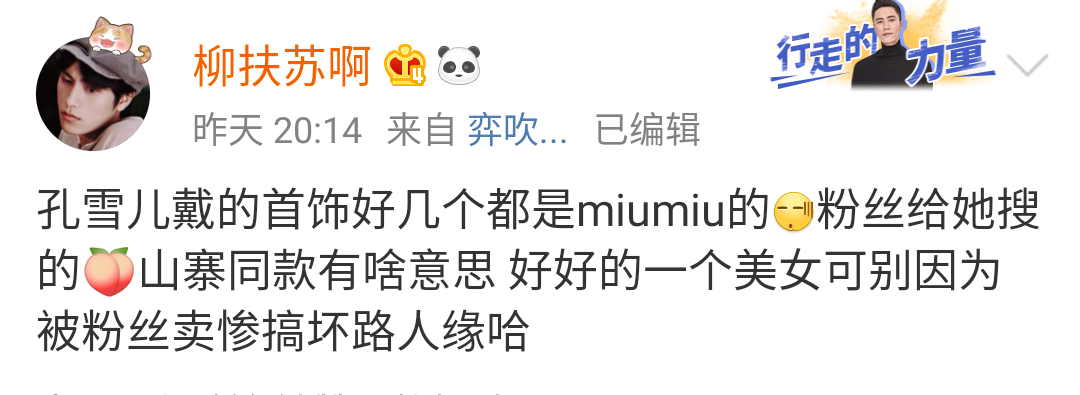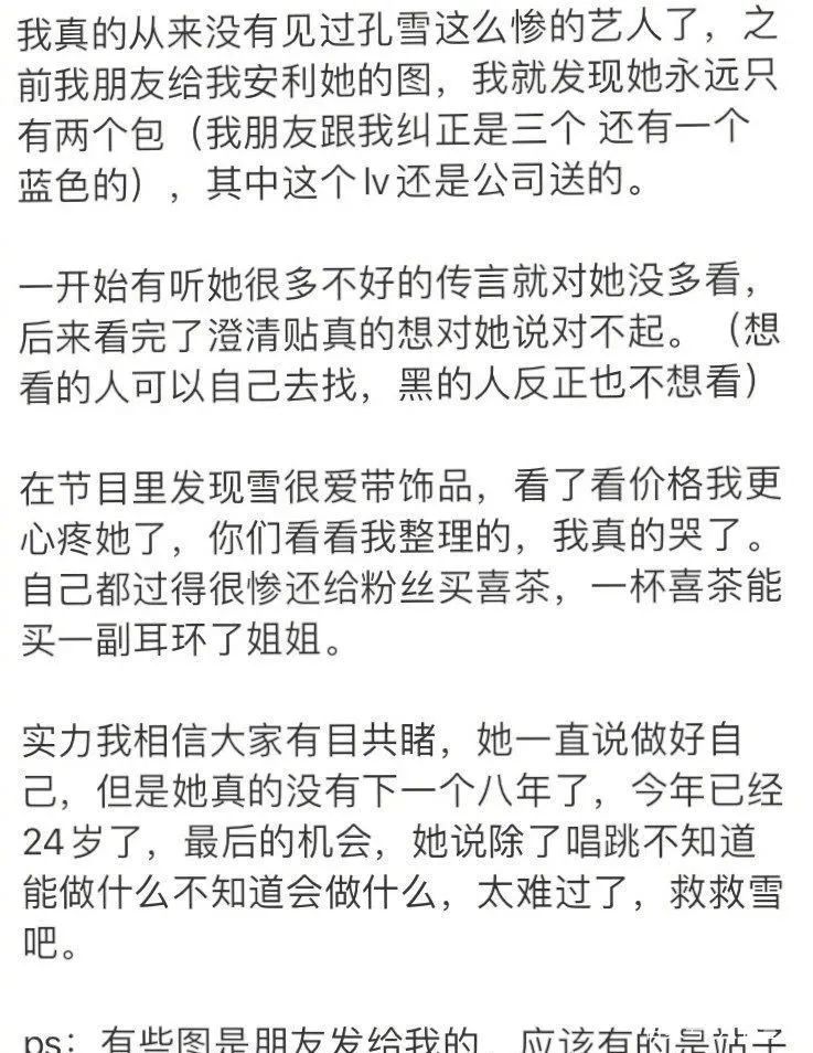 相比于其他女星各种高端名牌加身,孔雪儿是实名惨!不仅如此有粉丝爆料称即便如此,孔雪儿在机场看到粉丝会自己出钱为粉丝买饮品。孔雪儿这种“勤俭”的行为,瞬间拉高了大众好感度,有网友留言称突然对孔雪儿路转粉,自从参加节目后一直被曝各种黑料的孔雪儿似乎有些“洗白”的态势。