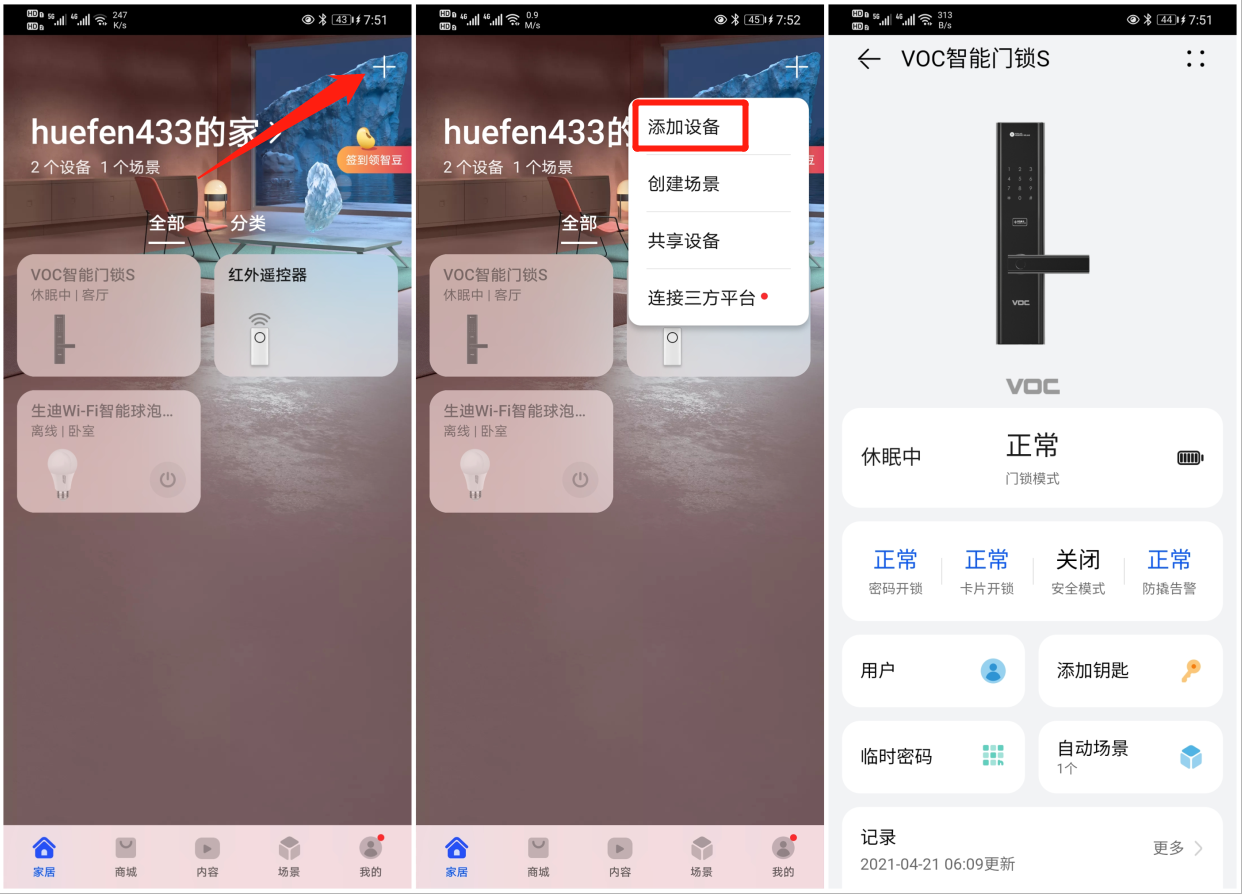 想实现更强大功能,就需要安装“智慧生活”APP,给华为智选VOC智能门锁S配网外面板上选择设备配网,APP端右上角添加设备即可,自动搜索很快,无任何难度。添加成功后,在家居首页就可以看到华为智选VOC智能门锁S了,点开后锁的状态显示、电量提醒都一目了然。