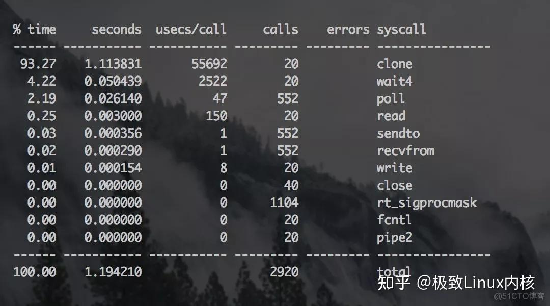闲言碎语不要讲,轮到Strace出场了,统计一下各个系统调用的耗时情况: