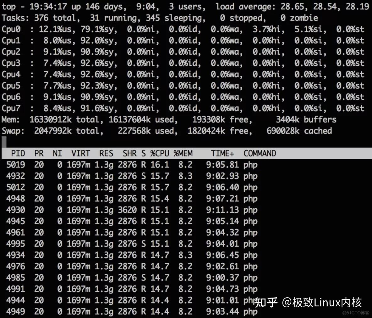 在本例中大家很容易发现 CPU 主要是被若干个 PHP 进程占用了,同时 PHP 进程占用的比较多的内存,不过系统内存尚有结余,SWAP 也不严重,这并不是问题主因。