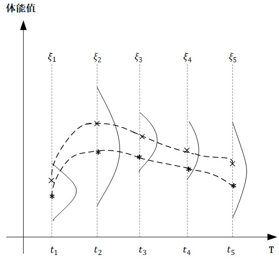 图中,我们取出了 t_1,t_2,t_3,t_4,t_5 五个时间点,分别代表同一个男性群体童年、少年、青年、中年、老年的具体时刻, \xi_1,\xi_2,\xi_3,\xi_4,\xi_5 分别对应五个时刻的体能值,他们都服从高斯分布,只不过从图中可以看出,均值和方差都不同,那么概率起来: