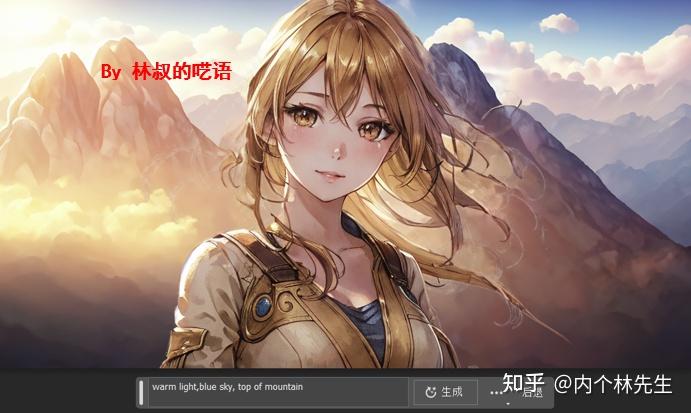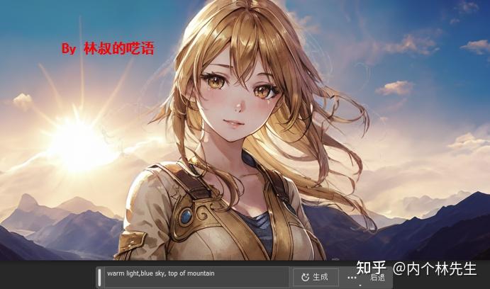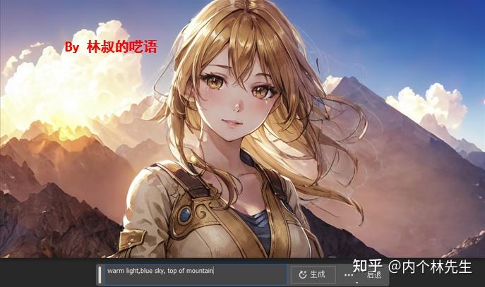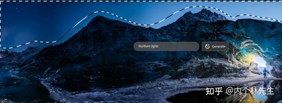 用裁剪工具扩大图片尺寸(你没看错,裁剪工具现在能扩大图片尺寸),点击“选择主体”,反选,输入提示词:warm light, blue sky, top of mountain
