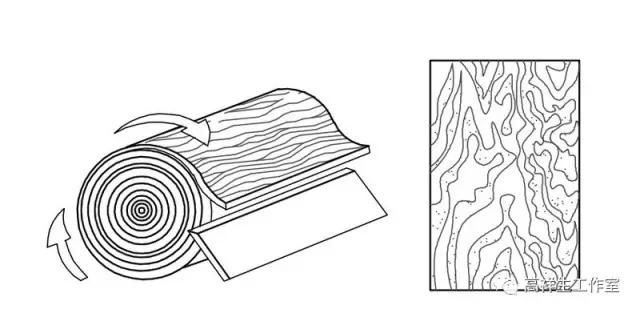 木材装修制品的加工有多种方法,如旋切法、平切法、1/4斜切法等。如图木材装饰加工方法。