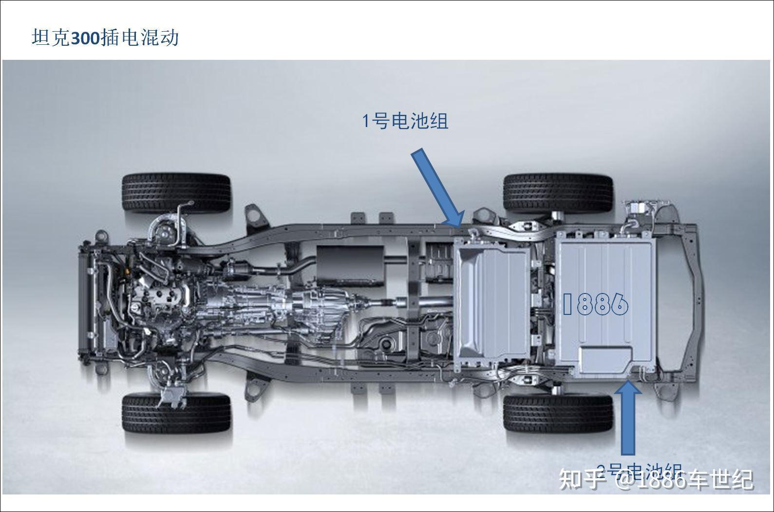 下图是Hi4-T的底盘布局示意图,可以看到,如果要求纯电长续航,一块电池是不够的,因此准备了两块电池组,分别布置在后排座椅下方以及后背箱底板位置。由于考虑到越野,涉水及磕碰等风险环境,长城没有冒险将电池布局在大梁之间的底盘位置,而是放置在大梁之上的车身内部,能利用上的空间,也只剩下后排座椅下方以及后备箱,代价就是牺牲部分车内空间,其实设计上可以克服的,但坦克500PHEV做的不够,使得座椅放倒不能实现平整,也没有7座椅,也失去原厂床车功能。对于坦克300PHEV,希望工程师能有所考虑,尽可能减薄坐垫,后排座椅翻到后能与与后箱底板对齐。