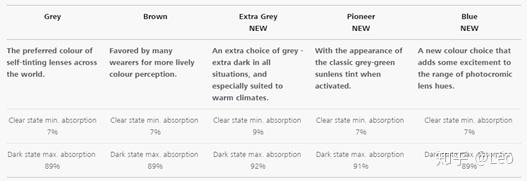 为了克服温度高颜色浅的问题,通过对染料和工艺进行优化,可以“ 加强 ”变色深度,而变色速度不受影响。例如蔡司近期推出的 PhotoFusion®产品新颜色Extra Grey (国内市场暂未开售) ,可以看到在变色状态下镜片较普通灰色约加深3%。