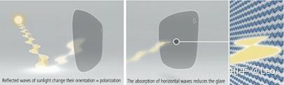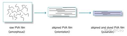 那么如何让镜片具有偏光过滤功能呢?这里需要用到偏光膜 - 一般由聚乙烯醇膜(PVA)在拉伸(取向)下使用碘化物或其他具备二向色性的物质进行染色而成,如下图所示: