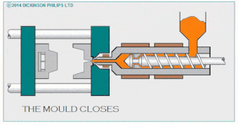注:除以上所说的染色外 ,还有另外一种生产有色太阳镜的方法:将色粉或色母粒(指含有色粉的塑料颗粒)均匀混入树脂中(通常为尼龙[PA]或聚碳酸酯[PC]),通过 注射成型 而成。如下图树脂被加热熔融后,通过加压以类似注射器的方式将物料注射入模具中,冷却后得到成型制品(镜片)。