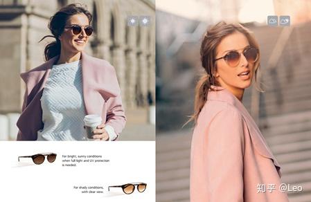 染色太阳镜的颜色可选范围很广,染色深度可以覆盖从极浅到极深的范围,适用于从室内到极度户外条件下的佩戴需要。但相应地,因为 染色深度固定,其应用场景较为单一 ,如深色或浅色镜片都不太适合应用在光线变化迅速的场合,另外部分颜色(绿,红等)也可能干扰物体本身色彩。一般情况下, 折中选择染色深度中等的镜片较为合适。