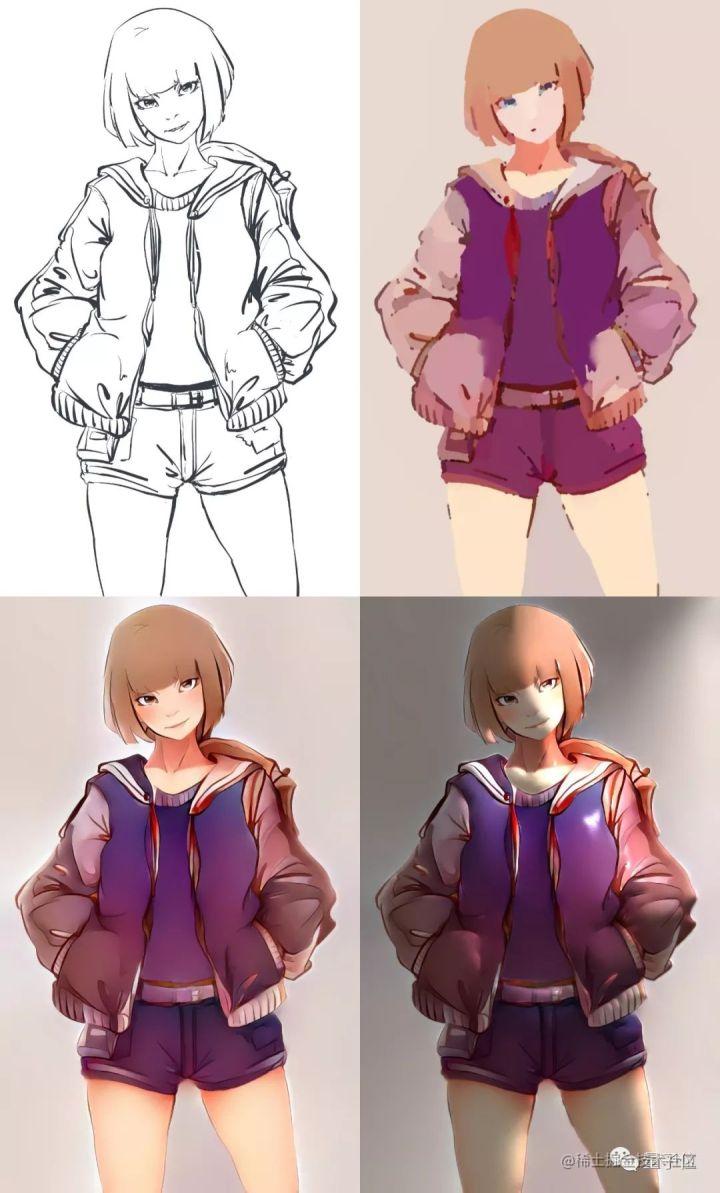 从线稿开始,到右上角 平面的颜色 (Flat Color) ,再到左下角 有梯度的颜色 (Color with Gradient) ,最后到右下角 加上阴影的结果 (Shaded Result) 。