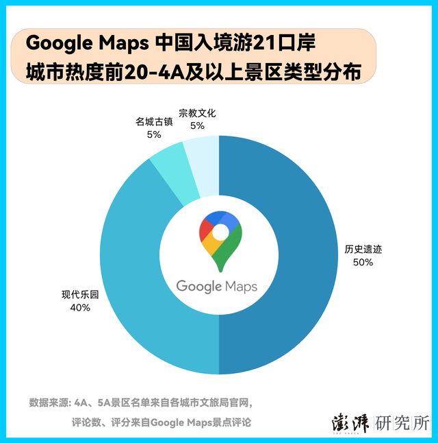 排在前20的景区中,历史遗迹类景区共10个,占到50%。而21口岸城市Google Maps热度排名第一的景区,共十城为历史遗迹类,分别为北京、石家庄、秦皇岛、南京、广州、沈阳、大连、西安、厦门、武汉。故宫博物院、颐和园、秦始皇陵景区、天坛公园等历史遗迹类景区皆属全球著名。根据2024年9月,中国旅游研究院(文化和旅游部数据中心)发布的“2024年入境游客喜爱的十个景区度假区”名单,故宫博物院、慕田峪长城、秦始皇陵景区均入选。
