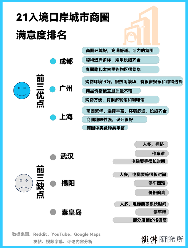 广州、成都、上海凭借丰富多元的商圈购物选择受到入境游客的好评。而对于商圈满意度较低的城市,停车难、电梯老旧缓慢等基础设施相关问题也亟待提升。