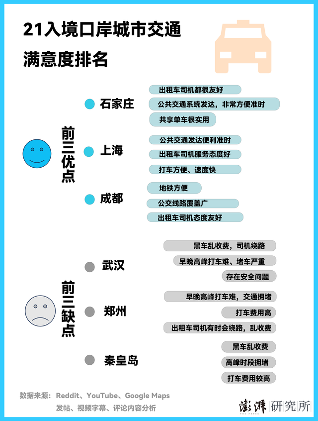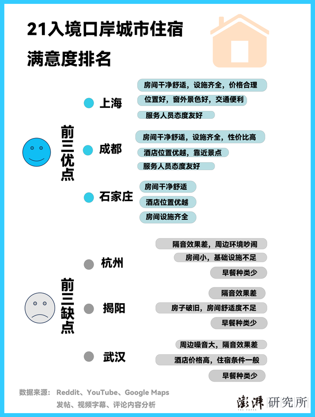 通过对21座口岸城市的:1)2024年各口岸(机场)入境航班量情况,分析各口岸城的入境接待情况;2)2024全年各口岸城在海外互联网平台Reddit与YouTube上的被讨论热度,分析其在不同类型平台上的受关注情况;3)海外用户在Reddit、YouTube、Google Maps的相关发帖、视频字幕、评论内容,从六大维度(住宿、餐饮、交通、支付、景区、商圈)分析海外游客对各城市的满意度评价;4)4A及以上景区在Google Maps上的评分与评论热度,分析其对全球游客的吸引力。